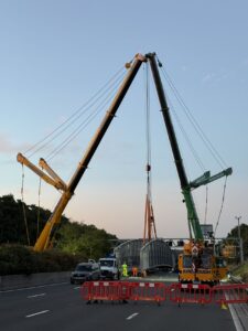 The successful installation was delivered during high summer temperatures, with multi-shift operations required to assemble and position the bridge. The operation was also made possible thanks to the efforts of Chevron Traffic Management, who ensured a safe, full closure of the M3 from 9pm on the Friday evening.