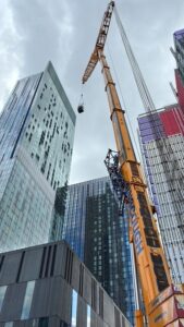 The project – connected to the construction of a new 24-storey hotel on Deansgate – required the safe and precise lifting of four plant room sections, each weighing three tonnes, along with eight condenser units weighing 0.5 tonnes each. These components were hoisted from transport vehicles at ground level to the rooftop of the hotel, within a carefully managed full road closure.